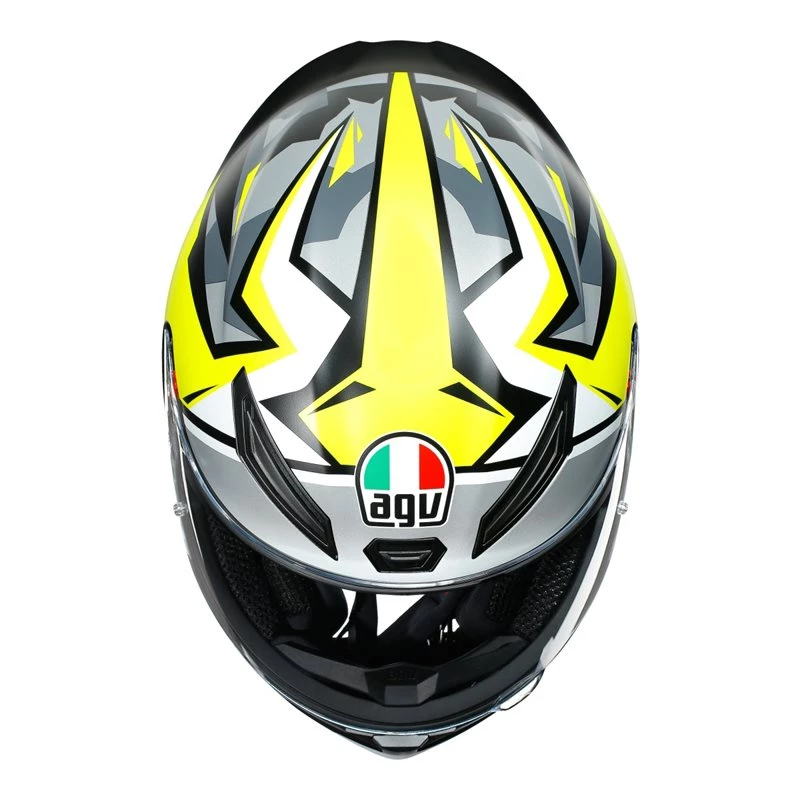 The AGV K1 has an aerodynamic shape, ventilation scheme, and spoiler developed for the wind tunnel tested Corsa R and Pista GP R. The shell and spoiler provide aerodynamic stability at speed and the spoiler itself features a passive rear vent to extract warm air from the helmet as you ride. The K1 also incorporates the central air intake above the visor taken directly from MotoGP developed Pista GP R to provide best-in-class ventilation.