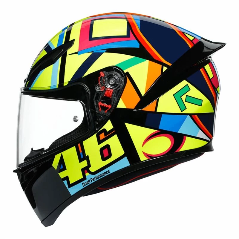 AGV K1 Helmet is a great sports helmet ideal for riders on a budget or as your first motorcycle helmet. Includes Double D retention system, comfort is no-compromise with Dry-Comfort softremovable and washable interior to make it easy to keep clean and fresh! plus a Pinlock ready, Panoramic anti-scratch visor allows a wider lateral and vertical field of vision for a total control of the environment. Aerodynamic shape, racing-developed front air vents and wind-tunnel engineered aero spoiler maximise performances while providing stability at higher speed. Weighing just over 1.5kg this incredibly light helmet is ideal for sports bike riders with its integrated spoiler and central air vents.