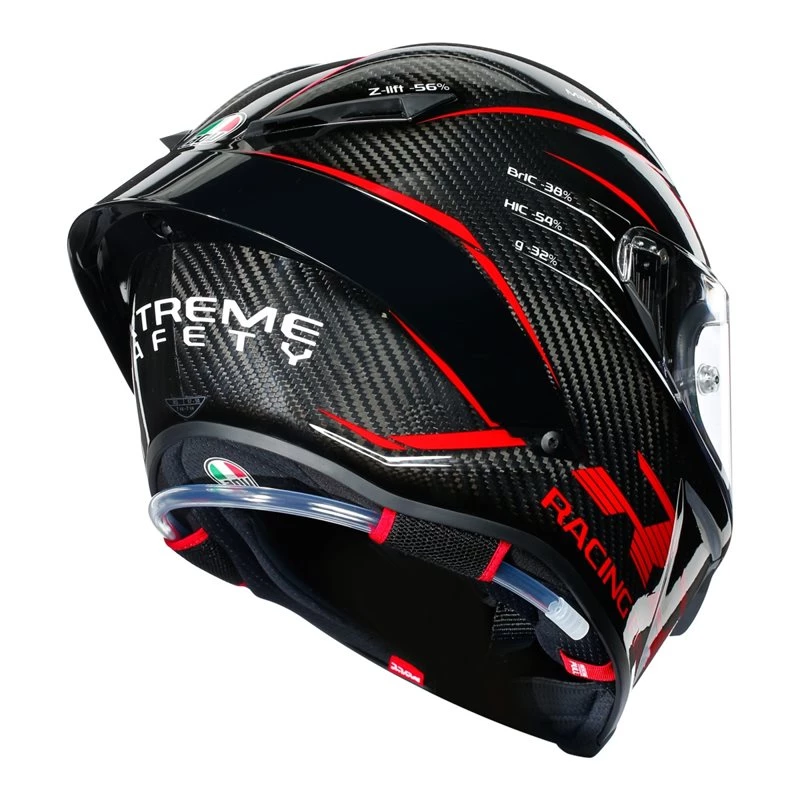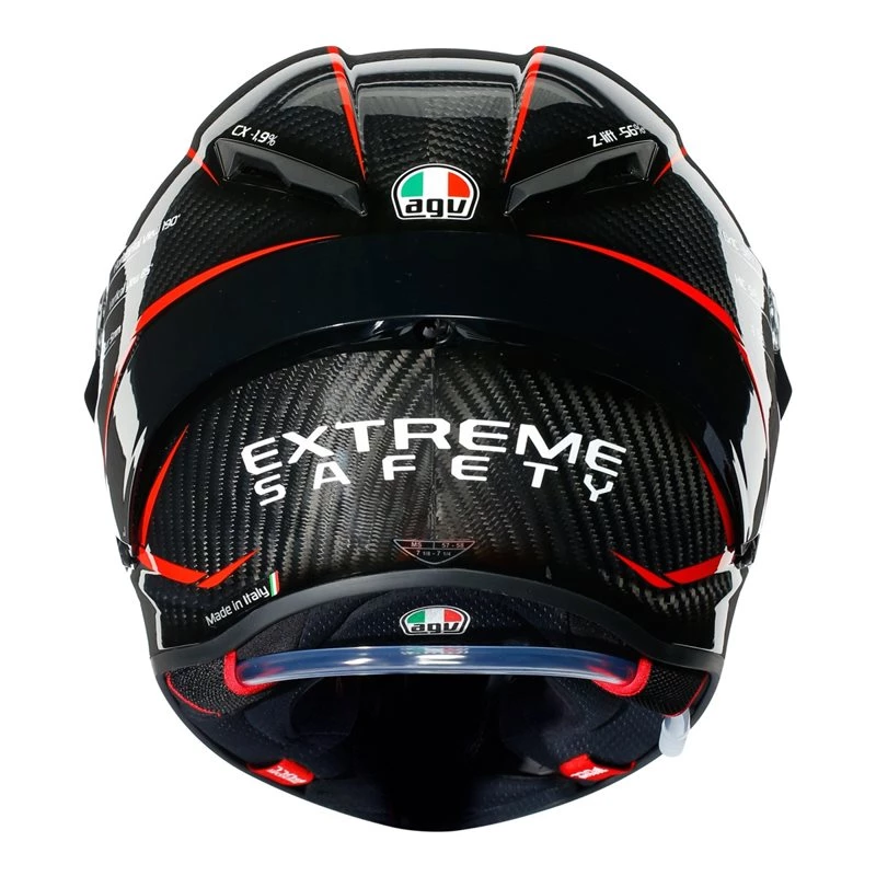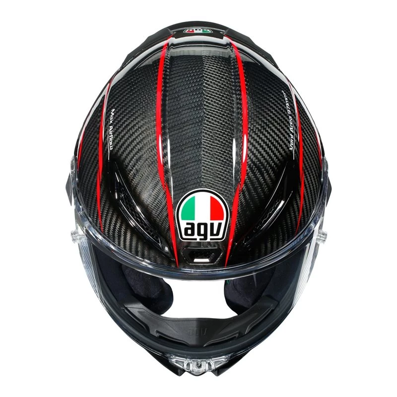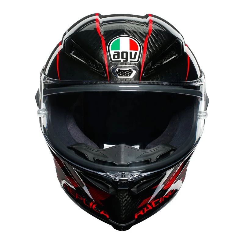 Pista GP RR is an exact replica of the AGV helmet used in races by professional world championship riders. It has therefore received FIM homologation, which certifies the highest possible level of protection, even against any dangerous twisting of the head. Every detail is designed to ensure ultimate performance. The Extreme Carbon shell in 100% carbon fiber guarantees extraordinary lightness, which make it effortless to wear. Its shapes and metal air vents are studied in the wind tunnel and tested by AGV athletes in order to ensure the best aerodynamic penetration and the greatest stability at high speeds, also as a result of the innovative profile of the rear PRO Spoiler. Boasting up to 5mm thickness, the optical class 1 Ultravision visor is an integral part of protection that enables 190° panoramic vision. This means the rider sees the track, adversaries, and obstacles more clearly, before anyone else. The exclusive 360° Adaptive Fit system allows for complete customization of the interior, giving the rider the possibility to select the ideal thickness for the upper part of the head, nape, and cheeks. Essential comfort that allows the rider to concentrate on the goal without distractions.
