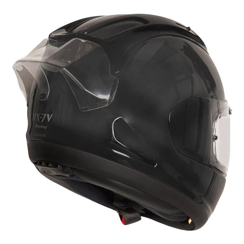 An RX-7V is everything Arai knows about producing the ultimate competition-ready motorcycle helmet. The strong, smooth and rounded R75 shape shell; to increase the important glancing-off performance. VAS system. Peerless fit. Ventilation that maintains a rider’s cool. And the RX-7V Racing goes one step further with an extra layer of technology. Aerodynamic assist.