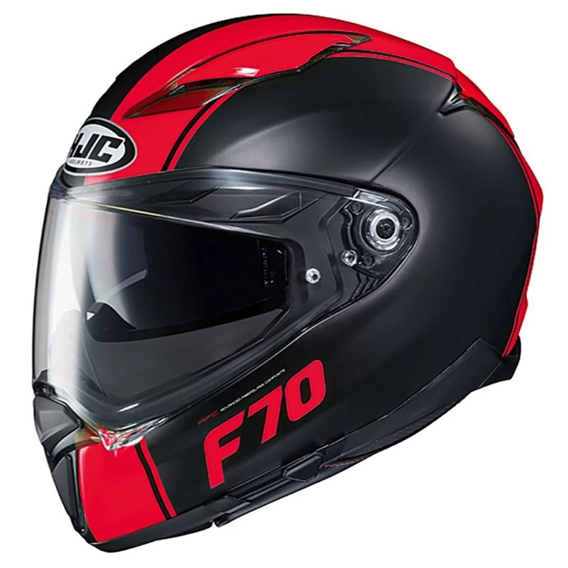 The HJC F70 Helmet brings technical design and materials at an affordable price point. Its aerodynamic shell is made out of fiberglass composite for a lightweight yet stiff exterior. HJC’s Advanced Channeling Ventilation System (ACS) helps move air through the helmet and pull heat and moisture out. Anti-bacterial fabric lining the interior wicks sweat away and dries quickly. Emergency quick release cheek pads are a welcome feature, usually reserved for more expensive track day helmets. An integrated drop down internal sun visor makes it easy to manage the sun without having to worry about bringing an extra face shield along. Speaker pockets allow the F70 Helmet to more easily take a bluetooth communication system. A breathe deflector and chin curtain are included from the factory, just a few of the details that HJC has considered.