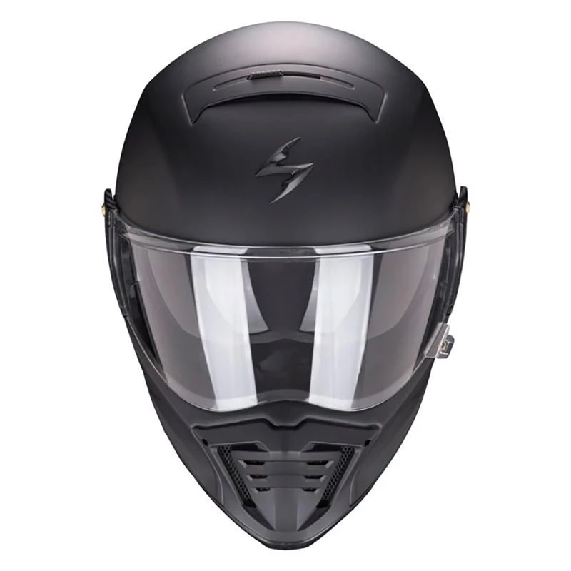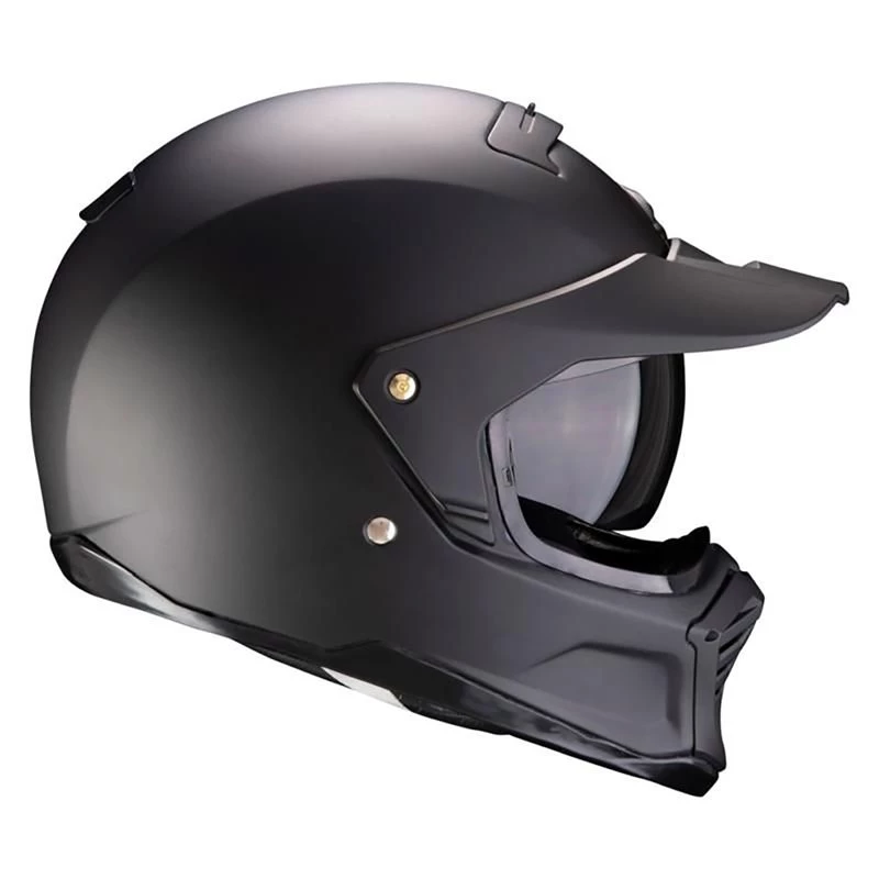 Scorpion’s retro philosophy presents various innovative functions and brings sleek and stylish shell designs while keeping classic streetfighter looks. The slim and small magnetic mechanism used for the face shield movement offers smooth opening and closing and helps to keep the shell line slender. The Exo HX1 can be changed to an off-road helmet with a peak which is included in the box. The visor and peak may also be removed to create a classic moto-cross style helmet as the eye port is large enough to accept most goggles.